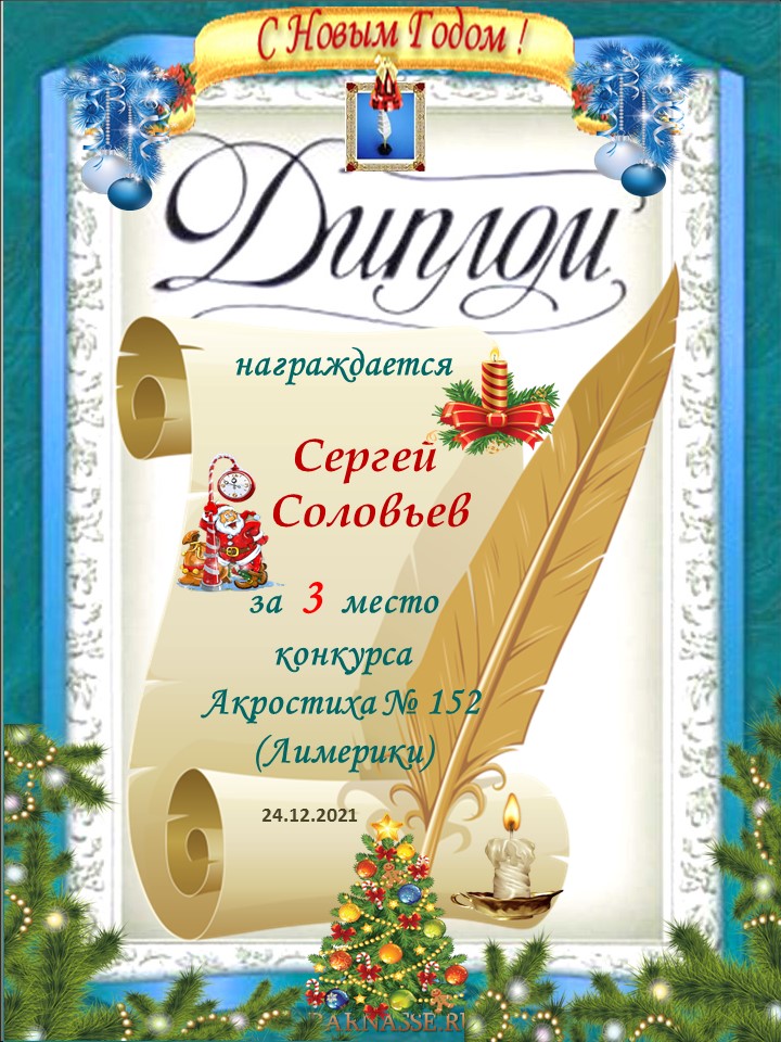 Диплом за 3 место в 152 конкурсе АКРОСТИХА (Альтернатива - лимерики)