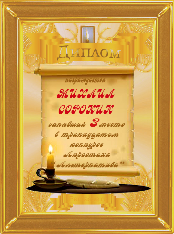 «Поздравляю, Михаил с 3 местом в 13 конкурсе АКРОСТИХА "АЛЬТЕРНАТИВА"!»