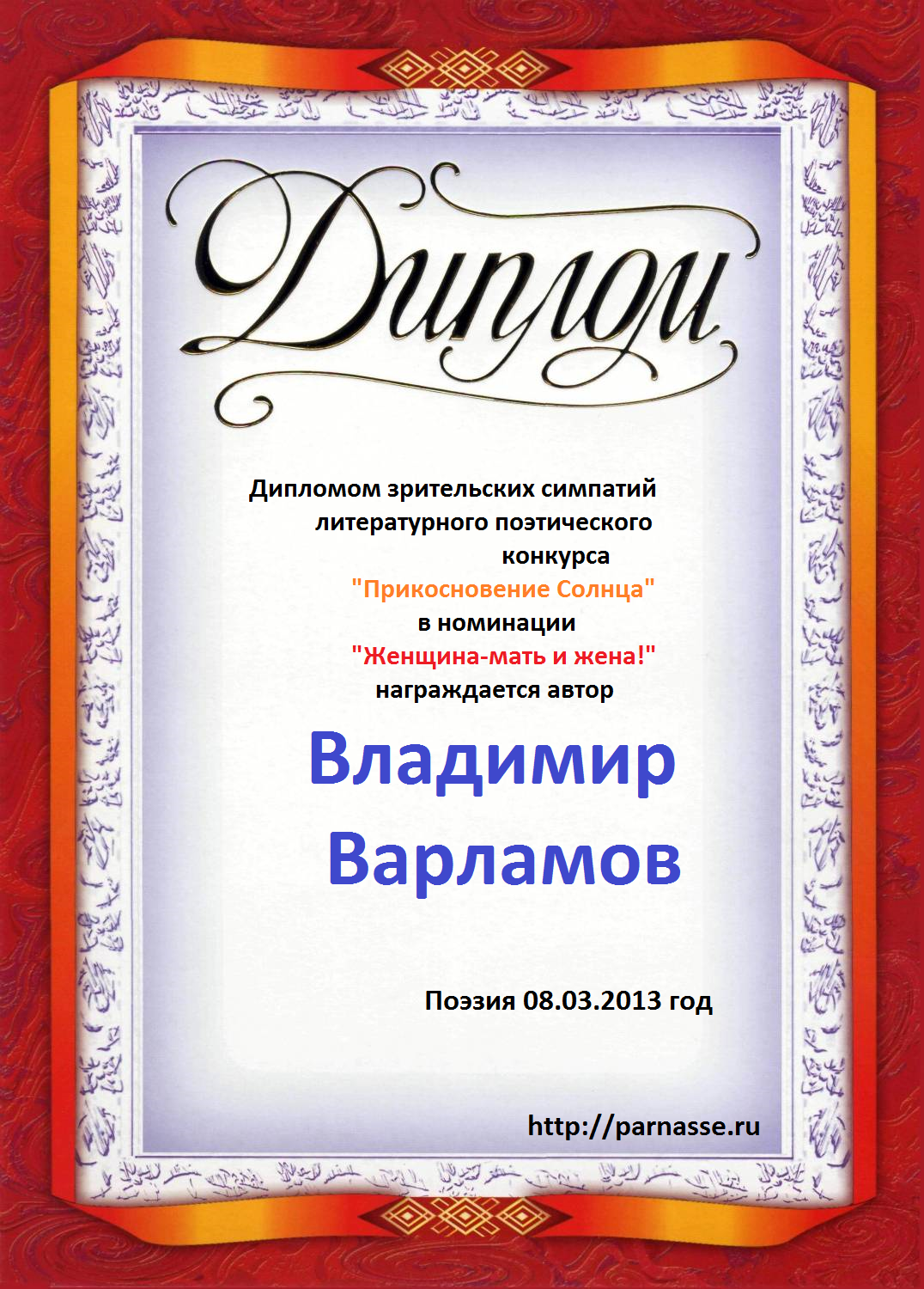 Диплом в конкурсе поэзии "Прикосновение Солнца"