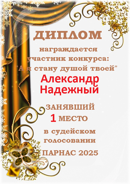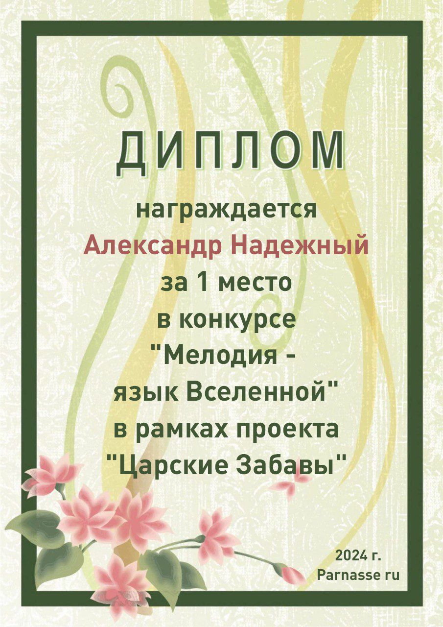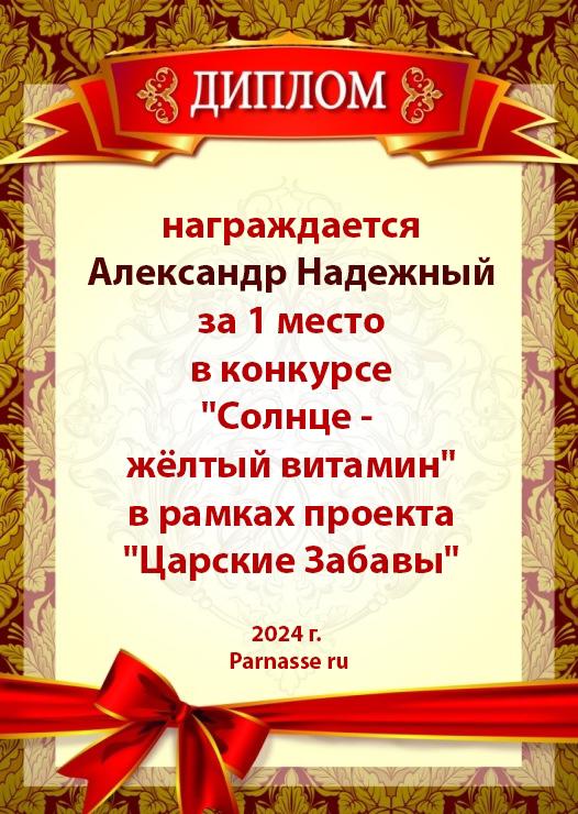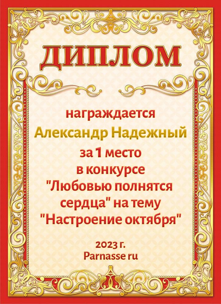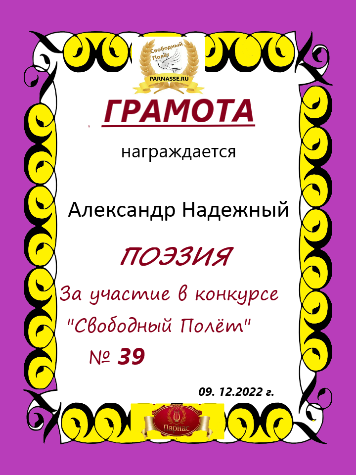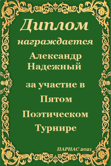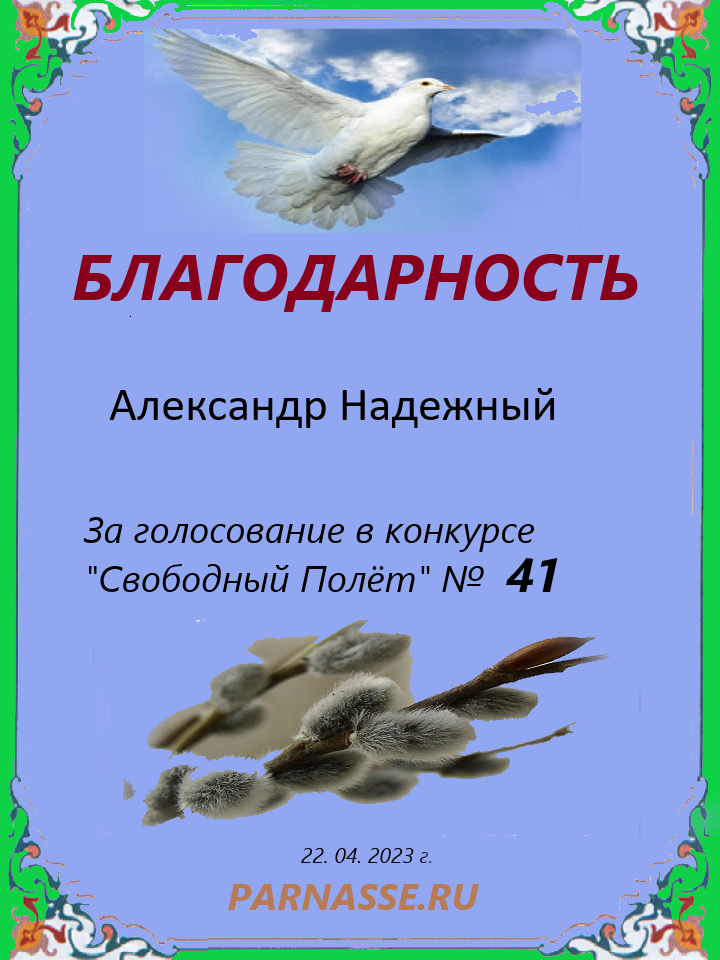Уважаемый Александр! Сердечно благодарим Вас за материальную и моральную поддержку "Парнасу"! Мы, в свою очередь, желаем Вам здоровья, любви, творческого вдохновения и исполнения всех Ваших желаний! Спасибо за Ваше прекрасное, талантливое творчество!