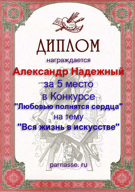 За 5 место в Конкурсе "Любовью полнятся сердца" на тему "Вся жизнь в искусстве" Поздравляем!