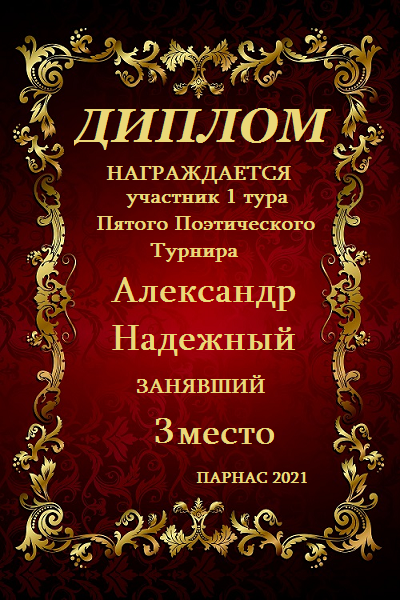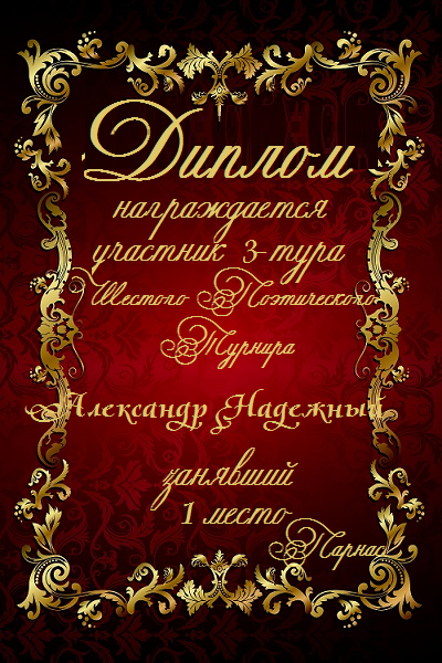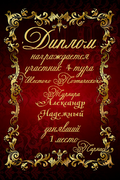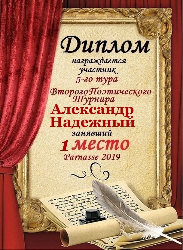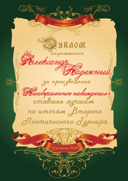 Первое место в 5-м туре Второго Поэтического Турнира " Звучит мелодия в стихах" за произведение «Незавершенное наваждение». Поздравляем!