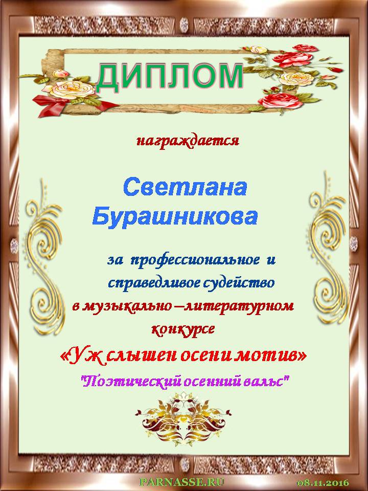 Благодарим Вас за квалифицированное, оперативное, беспристрастное судейство поэтической номинации "Поэтический осенний вальс" в музыкально-литературном конкурсе "Уж слышен Осени мотив". Большое спасибо, Светлана, за судейство, за потрясающе красивые, талантливые стихи. Удачи Вам, успехов, всех благополучий в жизни и делах. Спасибо, Светлана, за Вашу искренность, душевность и Ваш писательский талант!