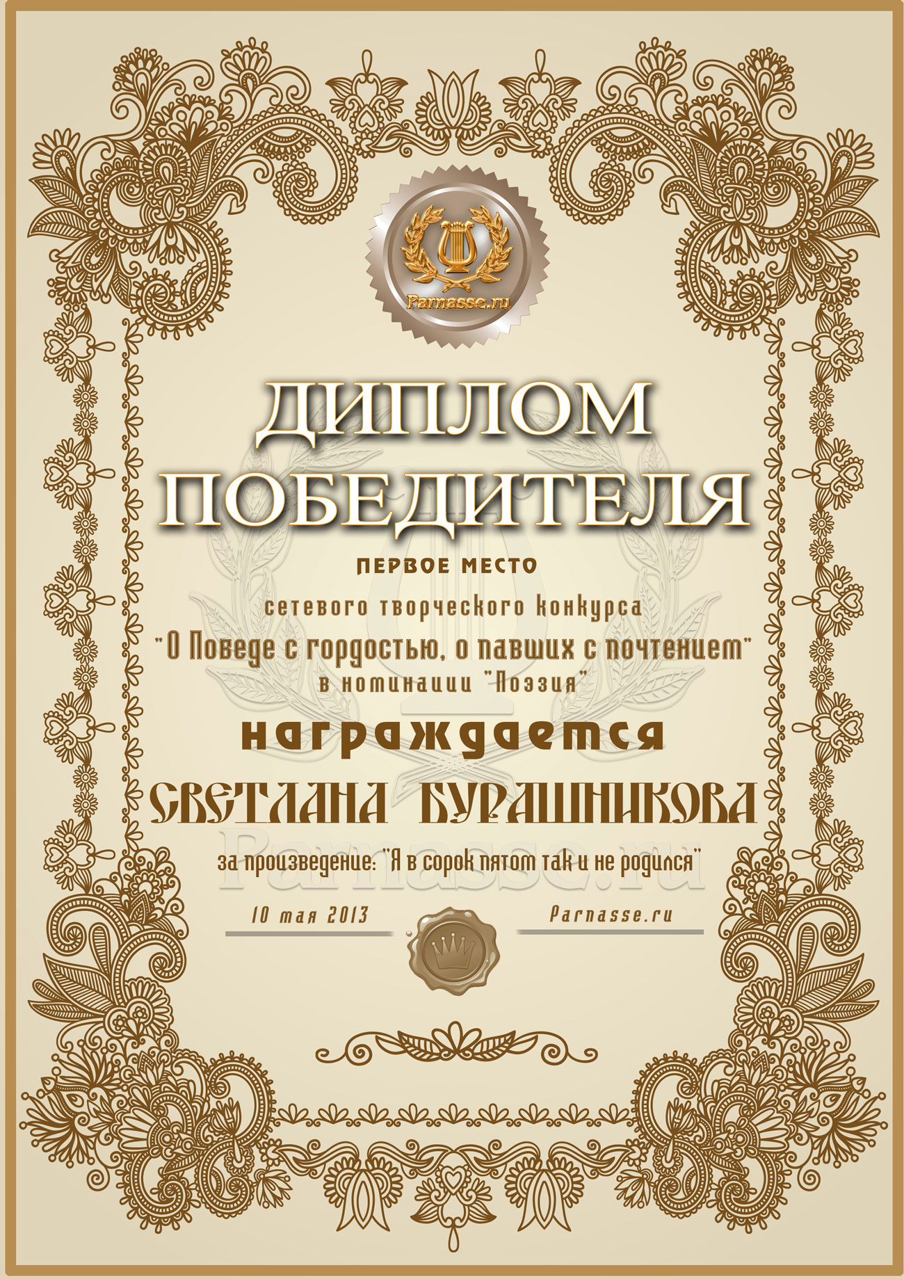 Первое место в музыкально-литературном конкурсе «О Победе с гордостью, о павших – с почтением!» Судейское голосование. Номинация в поэзии «ВЕЛИКАЯ ОТЕЧЕСТВЕННАЯ ВОЙНА»! Произведение «Я в сорок пятом так и не родился»! Поздравляем с заслуженной великолепной победой!