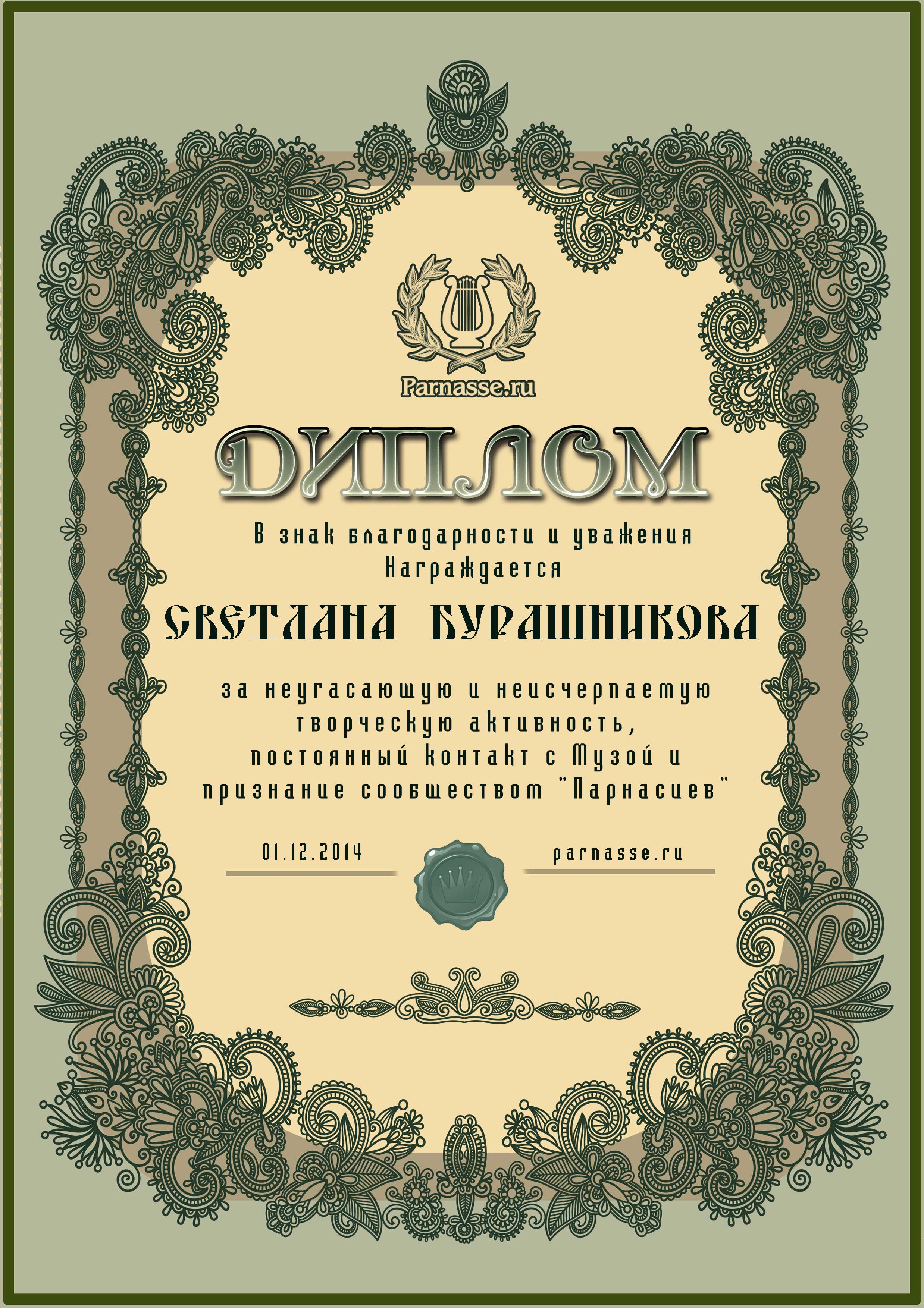 За неугасающую и неисчерпаемую творческую активность, постоянный контакт с Музой и признание сообществом "Парнасцев".От всей души желаем Вам, Светлана, здоровья, любви, успехов, благополучия, удачи и творческого вдохновения!