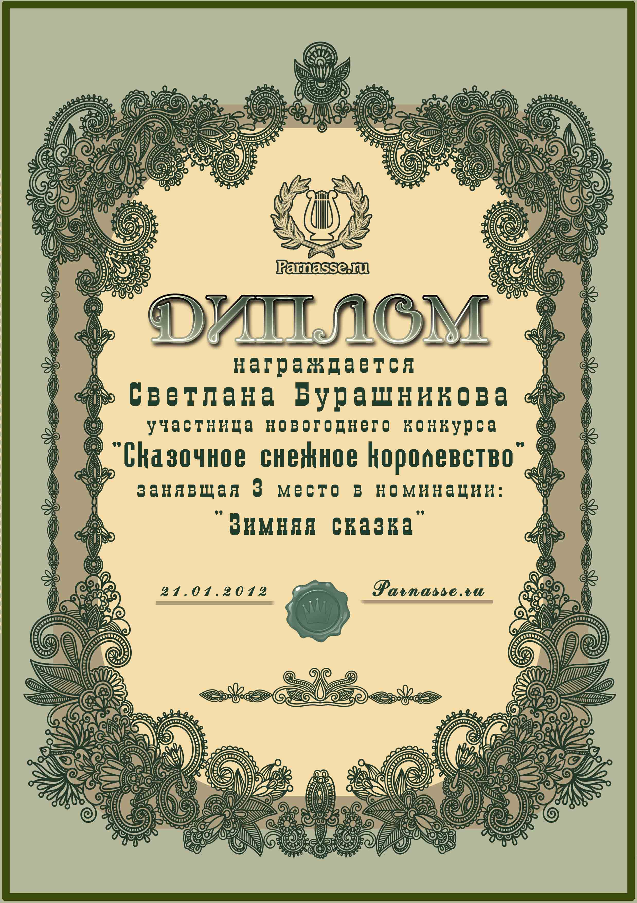 Второе место в музыкально-литературном конкурсе «ЗИМНЯЯ СКАЗКА», в номинации «Снежный карнавал»! Автору слов песни «Новый Год»! Поздравляем с блестящей победой в конкурсе, Светлана!