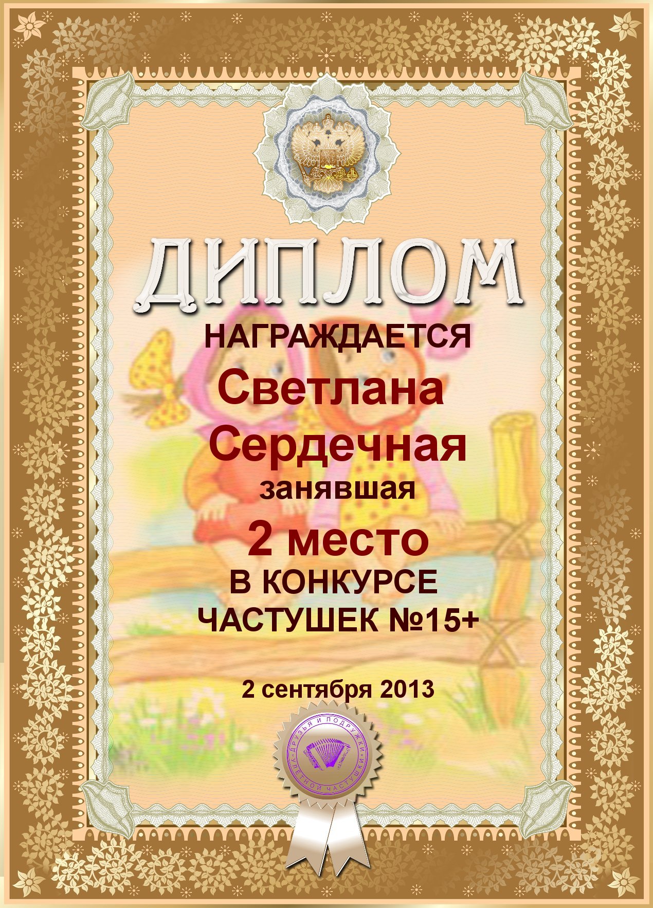 Третье место в анонимном конкурсе "Очень весёлые частушки" за произведение " Навострите ваши ушки"! Поздравляем, Светлана, с красивой победой в конкурсе!