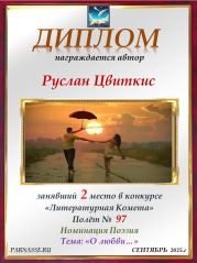 Поздравляю с занятым 2 местом в конкурсе "ЛитКомета - Полёт № 97" - Номинация Поэзия!
