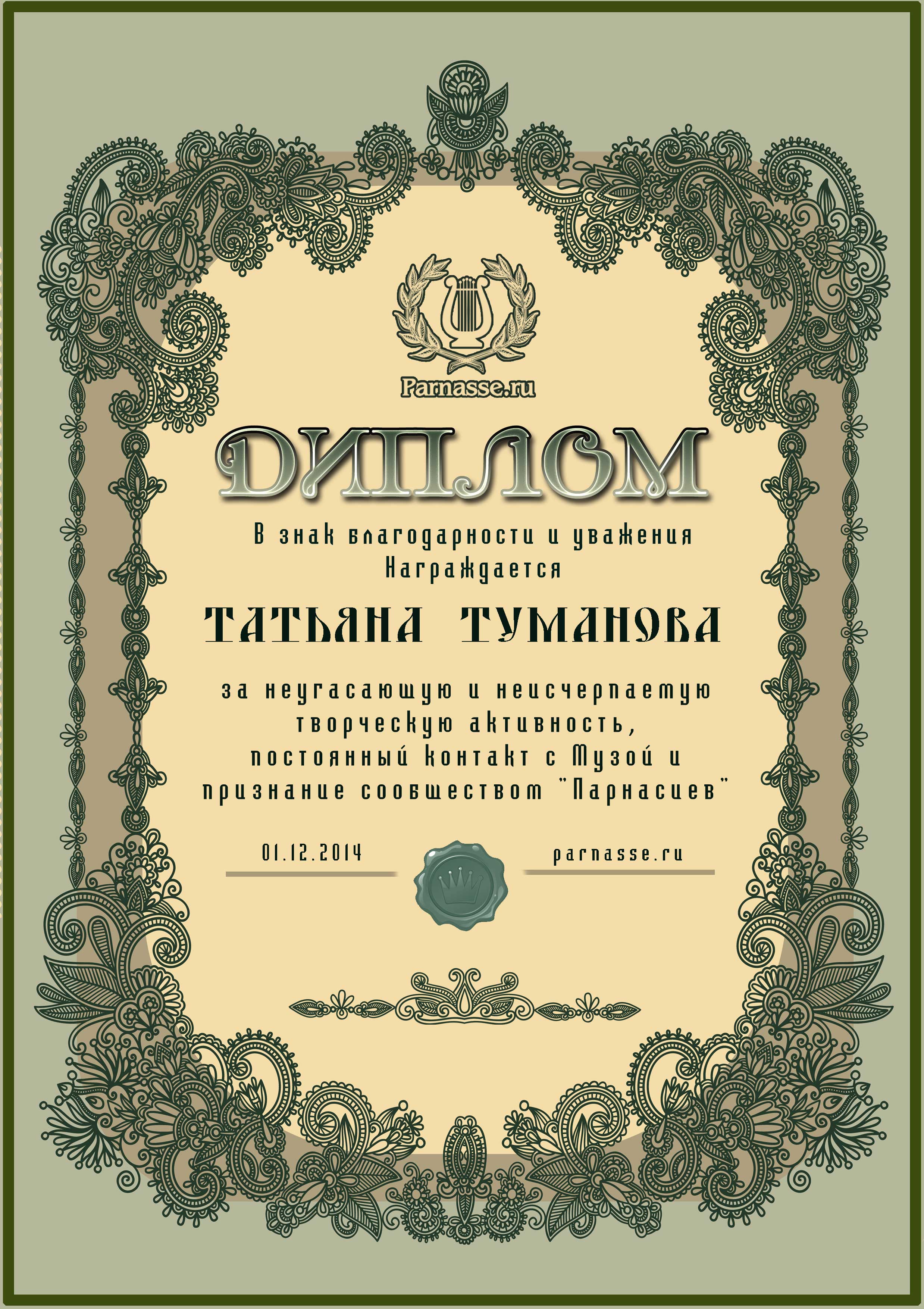 За неугасающую и неисчерпаемую творческую активность, постоянный контакт с Музой и признание сообществом "Парнасцев".От всей души желаем Вам, Татьяна, здоровья, любви, успехов, благополучия, удачи и творческого вдохновения!
