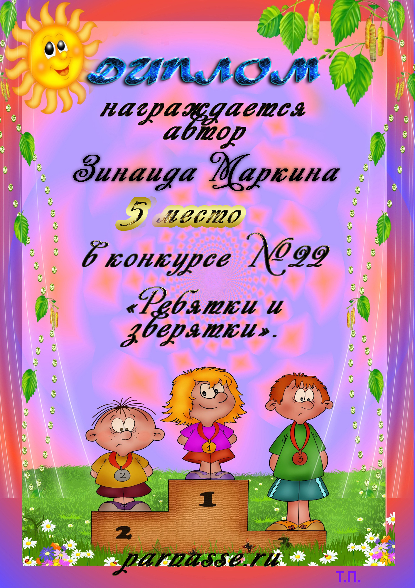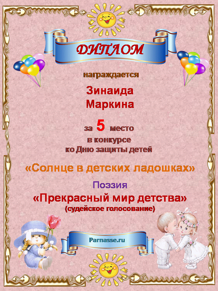 За пятое место в конкурсе, посвященном Дню защиты детей. Судейское голосование. Поэтическая Номинация "Прекрасный мир детства". Произведение "Шпион". Поздравляем с победой.