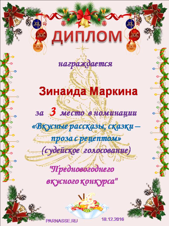 Третье место в музыкально-литературном конкурсе "Предновогодний Вкусный" в номинации "Вкусные рассказы, сказки - проза с рецептом", произведение "Салат для опоздавшего", судейское голосование. Поздравляем с прекрасной победой. Счастья Вам, здоровья, удачи во всем, благополучия и вдохновения. Новых замечательных произведений.