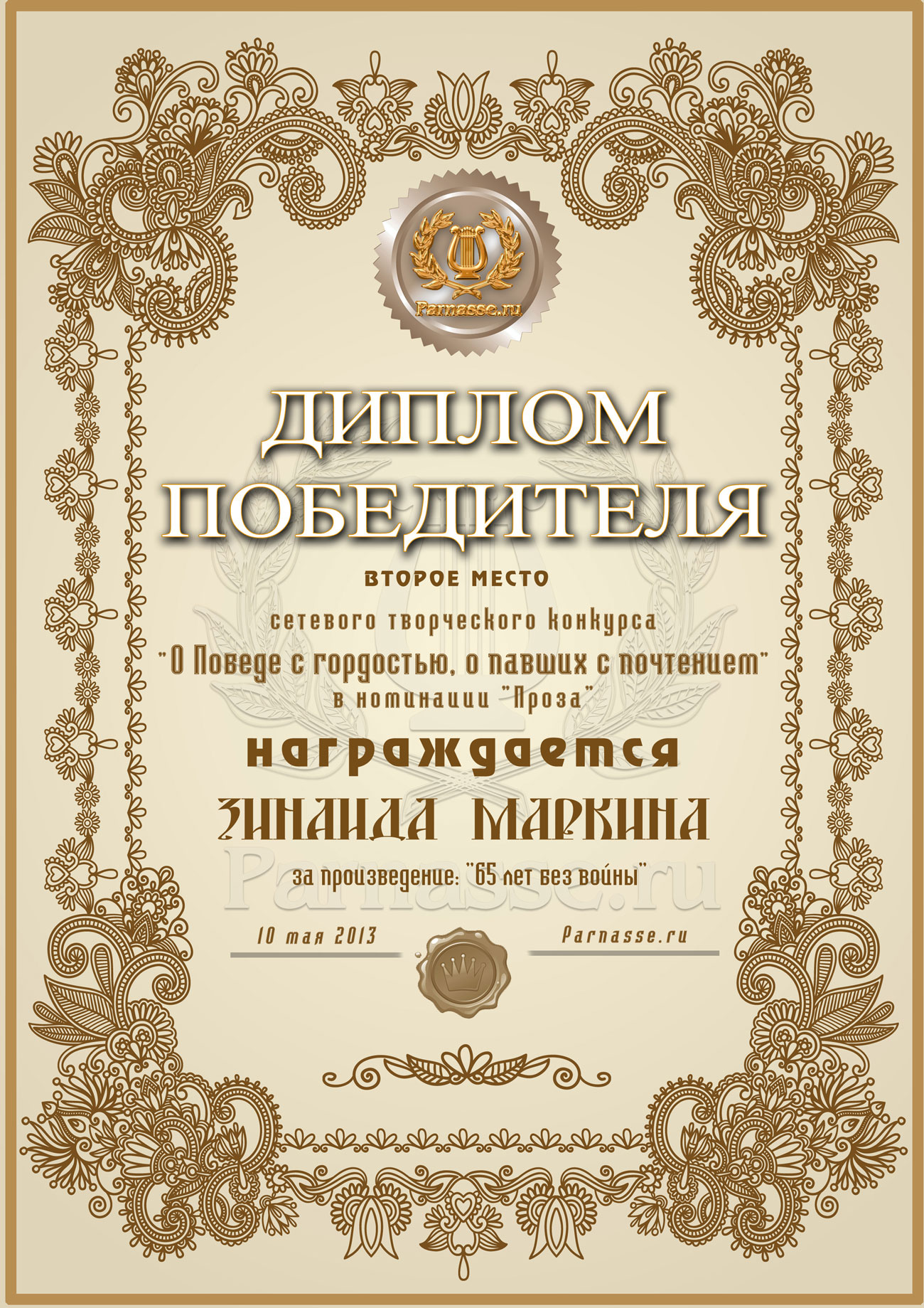 Второе место в конкурсе "О Победе с гордостью, о павших с почтением" (За произведение "65 лет без войны")