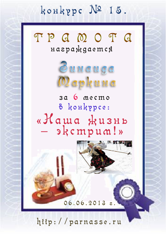 Грамота за 6 место в 15 конкурсе "Наша жизнь - экстрим"