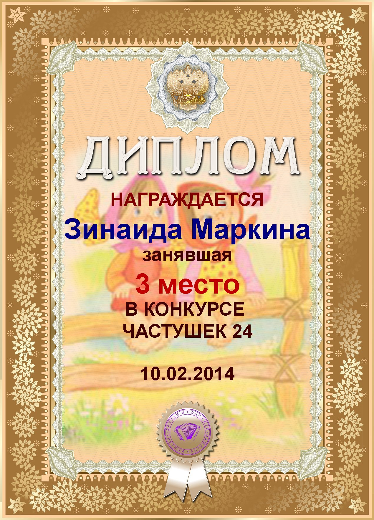 ![]() Бронзовая медаль "Победителя музыкально-литературного Предпраздничного "Вкусного" конкурса"