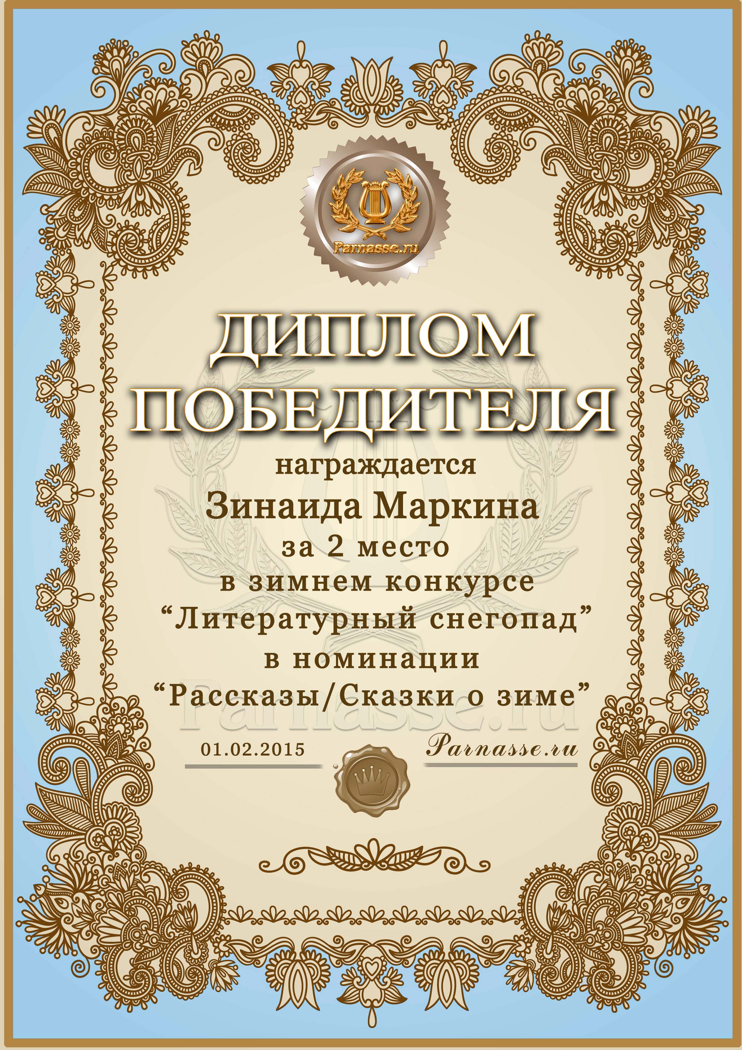 Диплом за 2 место в конкурсе "Литературный снегопад".