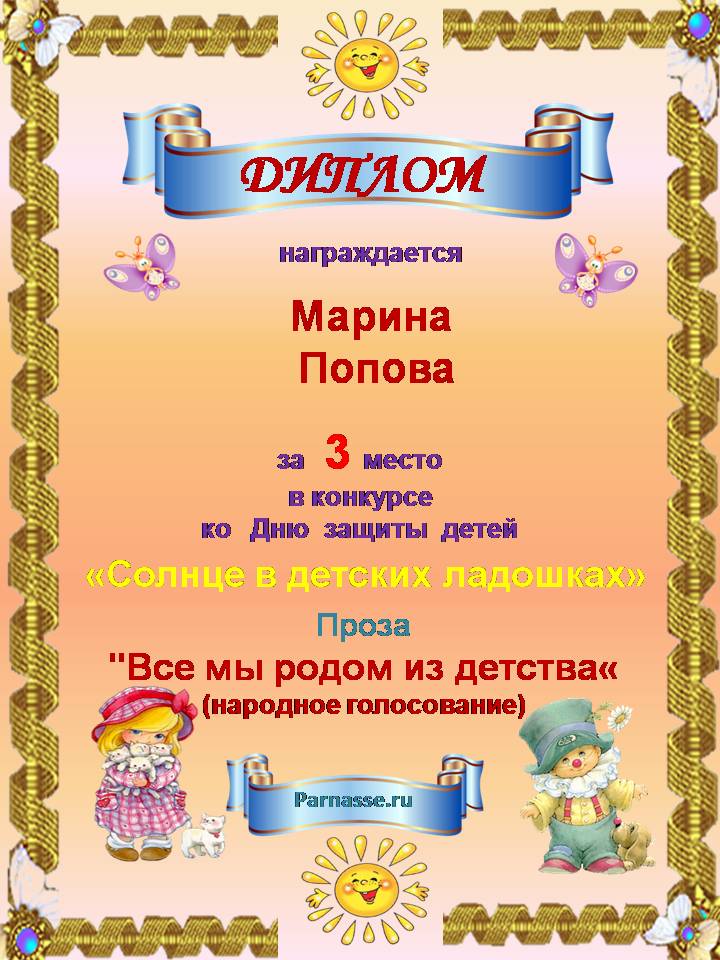 За третье место в конкурсе, посвященном Дню защиты детей. Народное голосование. Прозаическая Номинация "Все мы родом из детства". Произведение "Два дня из жизни Ромы". Поздравляем с прекрасной победой.
