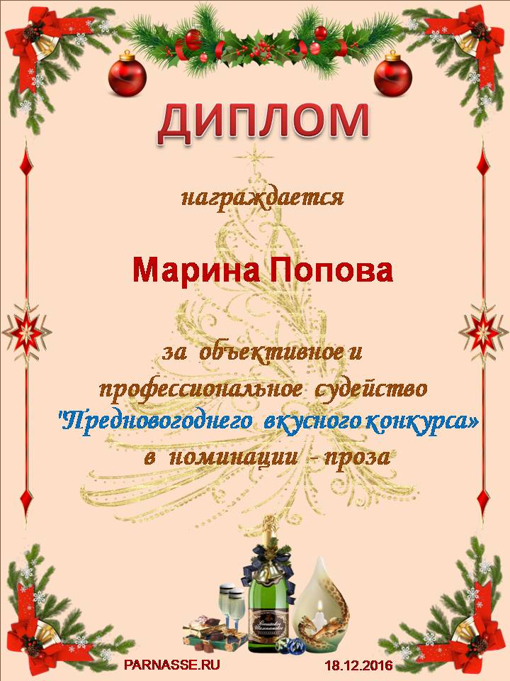 Благодарим Вас, Марина, за профессиональное и объективное судейство номинации "Вкусные рассказы, сказки - проза с рецептом" в конкурсе "Предновогодний вкусный". Огромное спасибо! От всей души поздравляем Вас с наступающим Новым 2017 Годом! Счастья и радости, здравия и всех благ, удачи на все года! С большой благодарностью, признательностью.