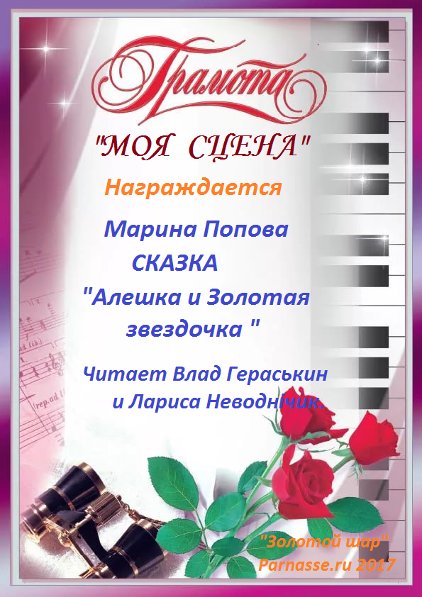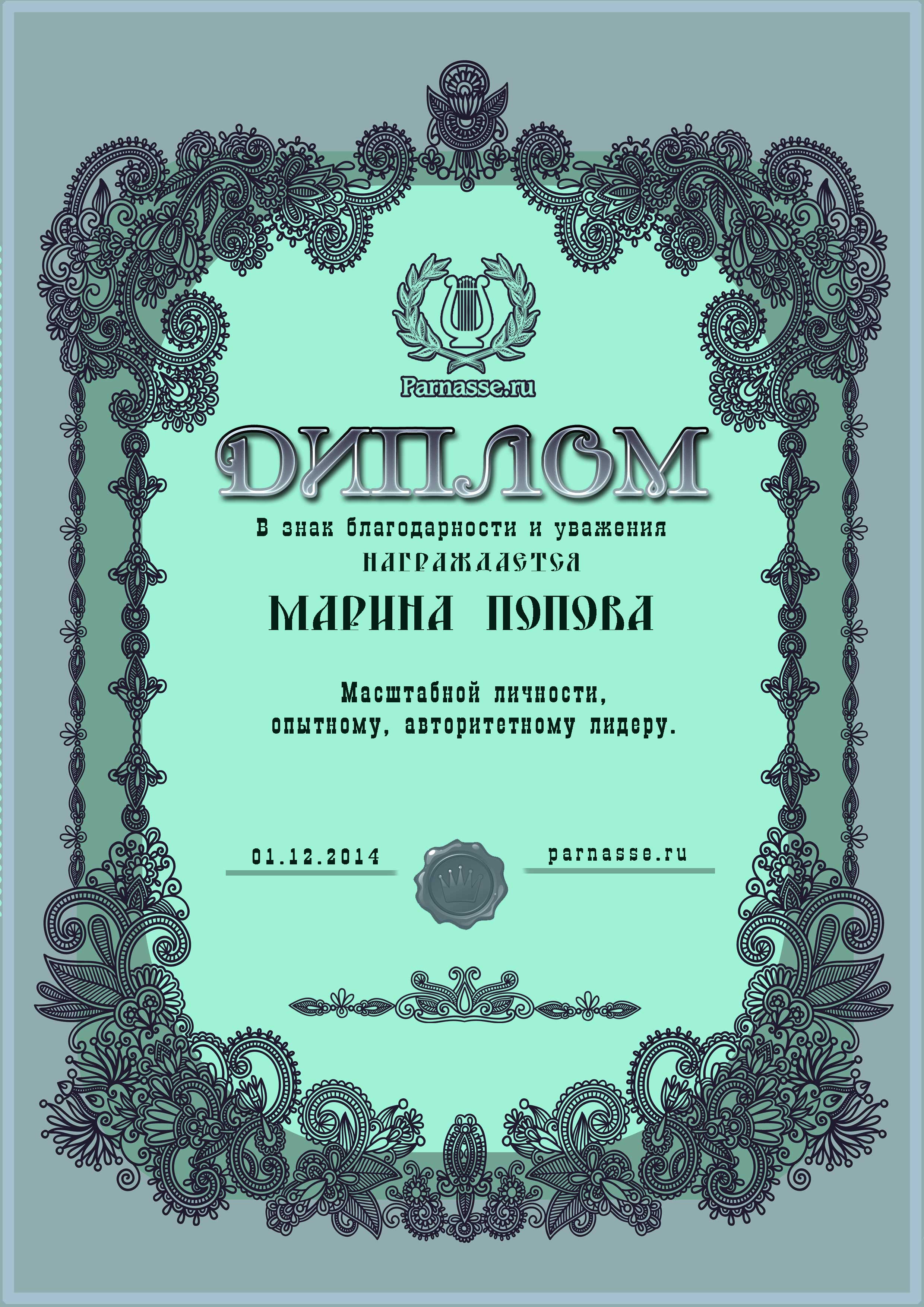 За неугасающую и неисчерпаемую творческую активность, постоянный контакт с Музой и признание сообществом "Парнасцев".От всей души желаем Вам, Марина, здоровья, любви, успехов, благополучия, удачи и творческого вдохновения!
