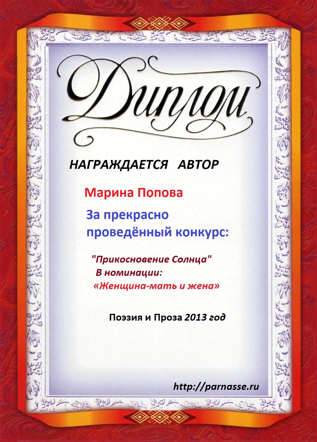 За проведение Конкурса «Прикосновение Солнца» - Проза
