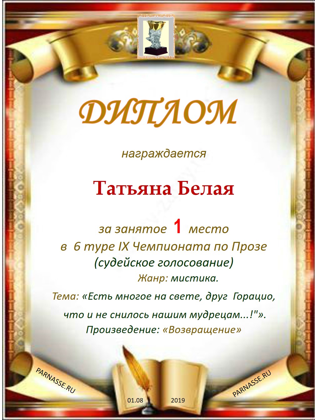 Поздравляю с занятым 1 местом в IX Чемпионате Парнаса по прозе – 6 тур (судейское голосование)
