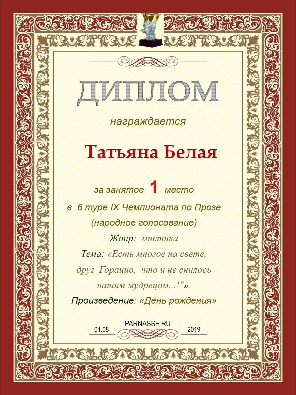 Поздравляю с занятым 1 местом в IX Чемпионате Парнаса по прозе – 6 тур (народное голосование)