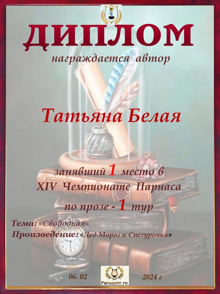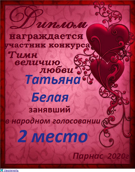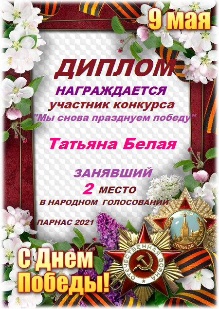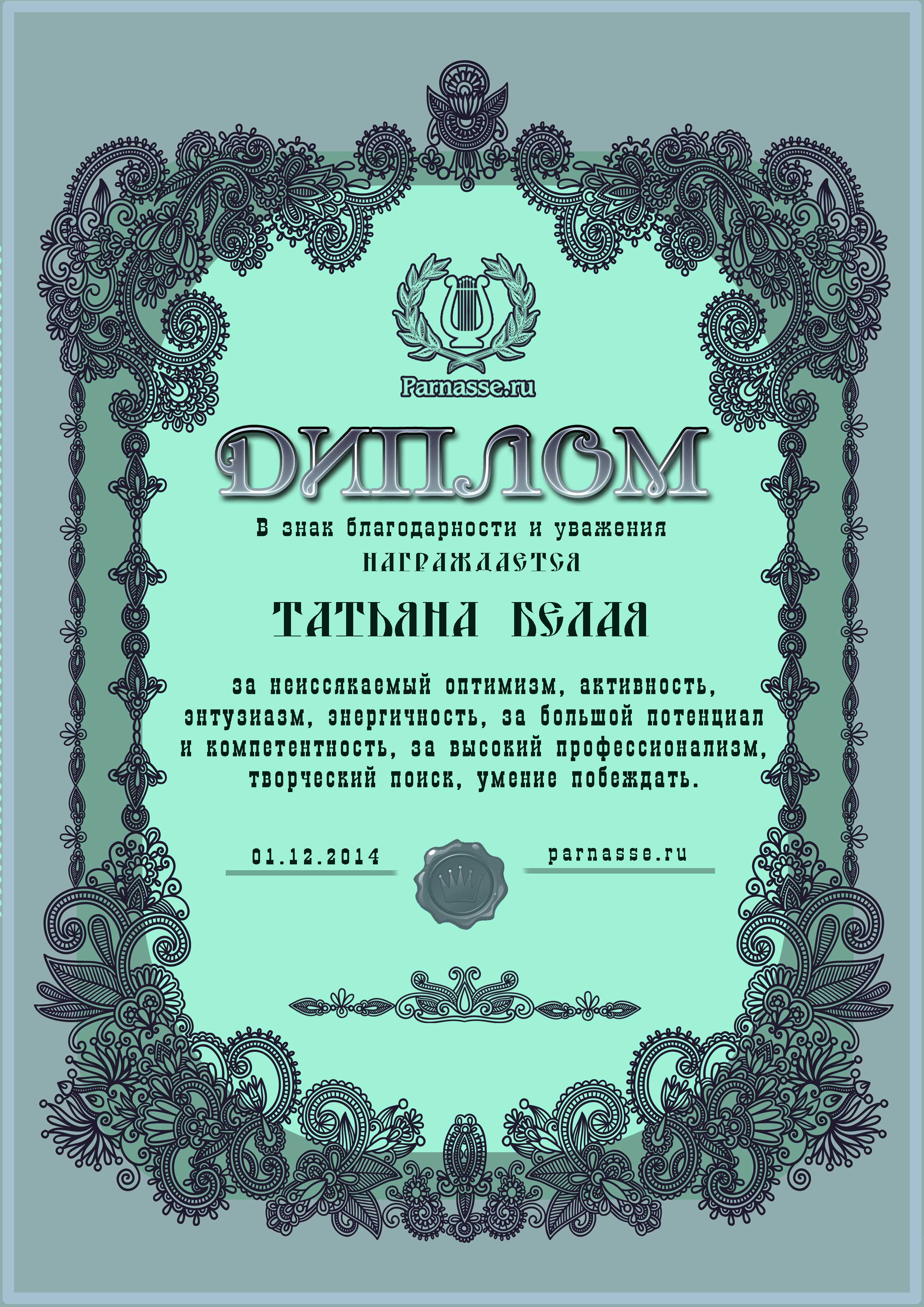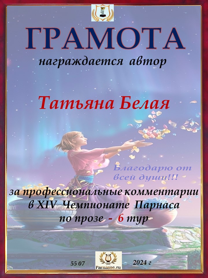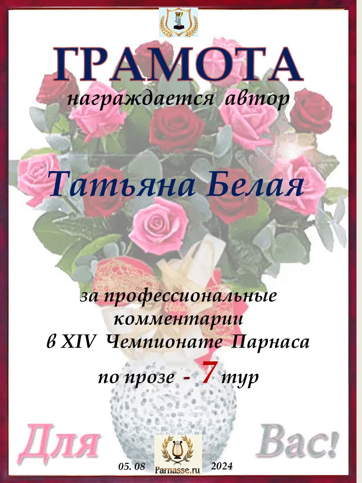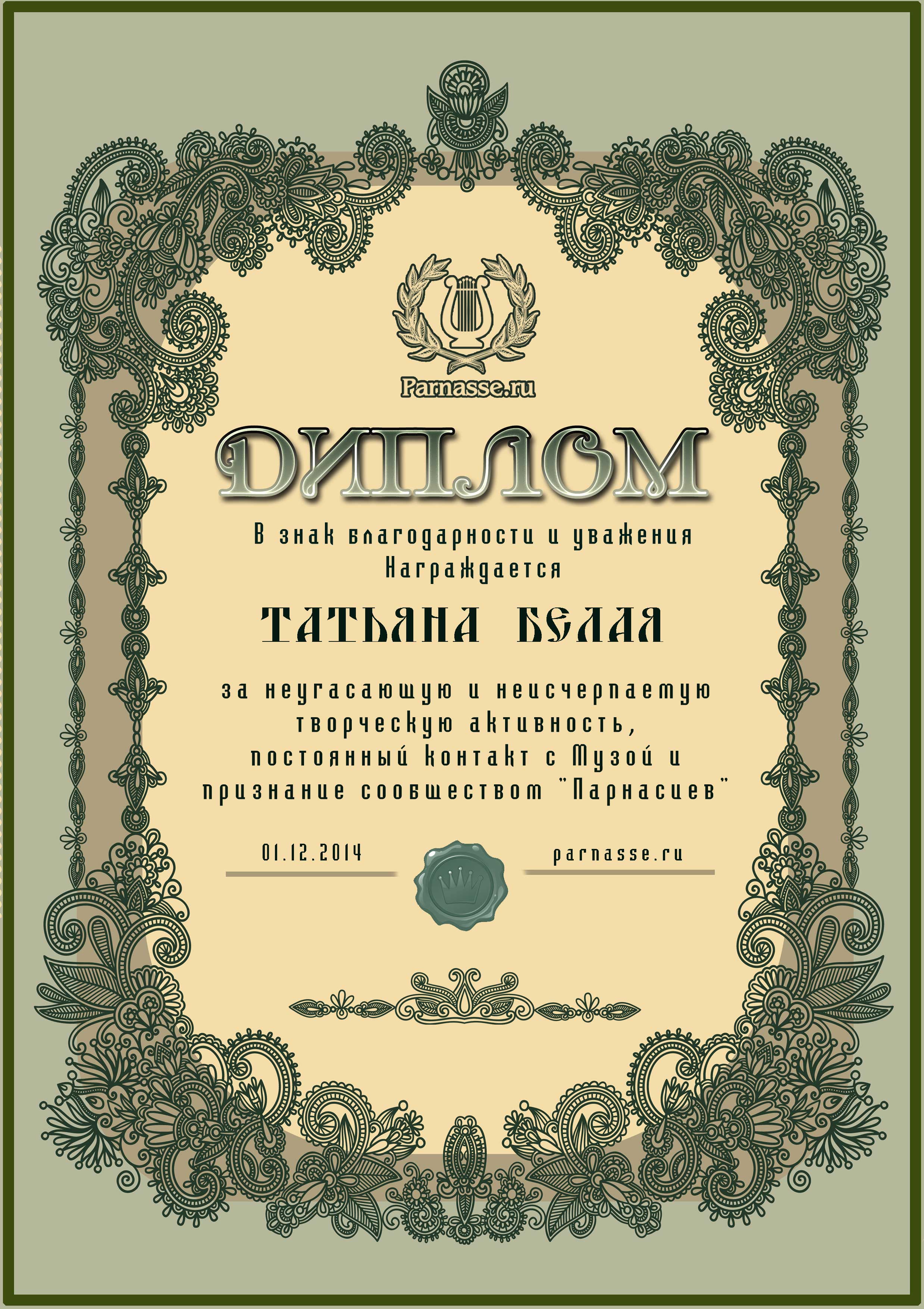 За неугасающую и неисчерпаемую творческую активность, постоянный контакт с Музой и признание сообществом "Парнасцев".От всей души желаем Вам, Татьяна, здоровья, любви, успехов, благополучия, удачи и творческого вдохновения!