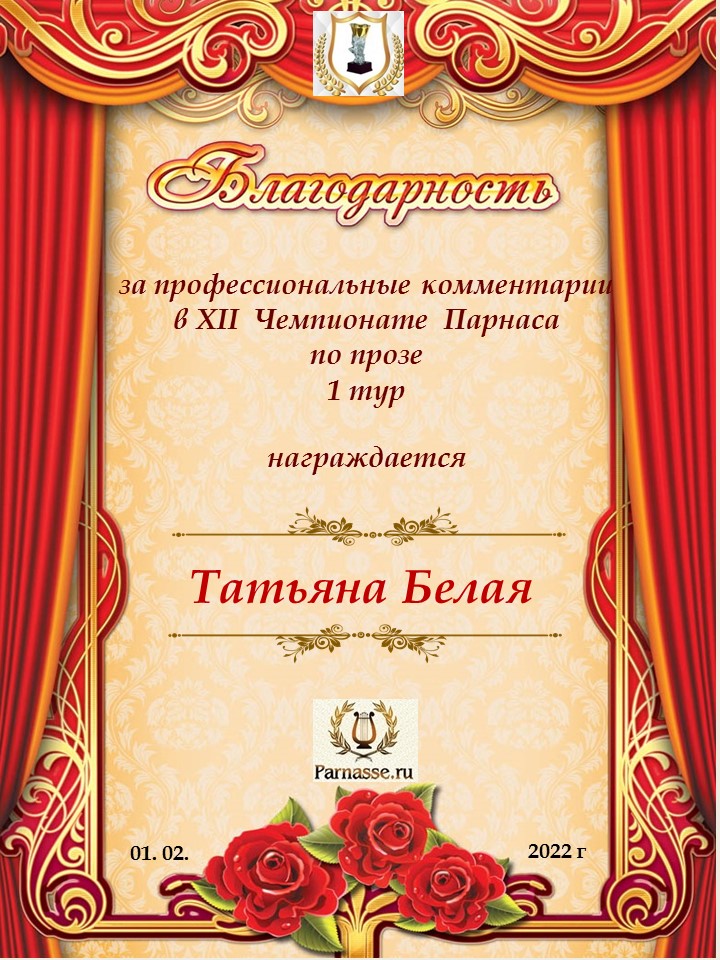 Спасибо за высокопрофессиональное и объективное судейство в 1 туре X Чемпионата Парнаса по Прозе!