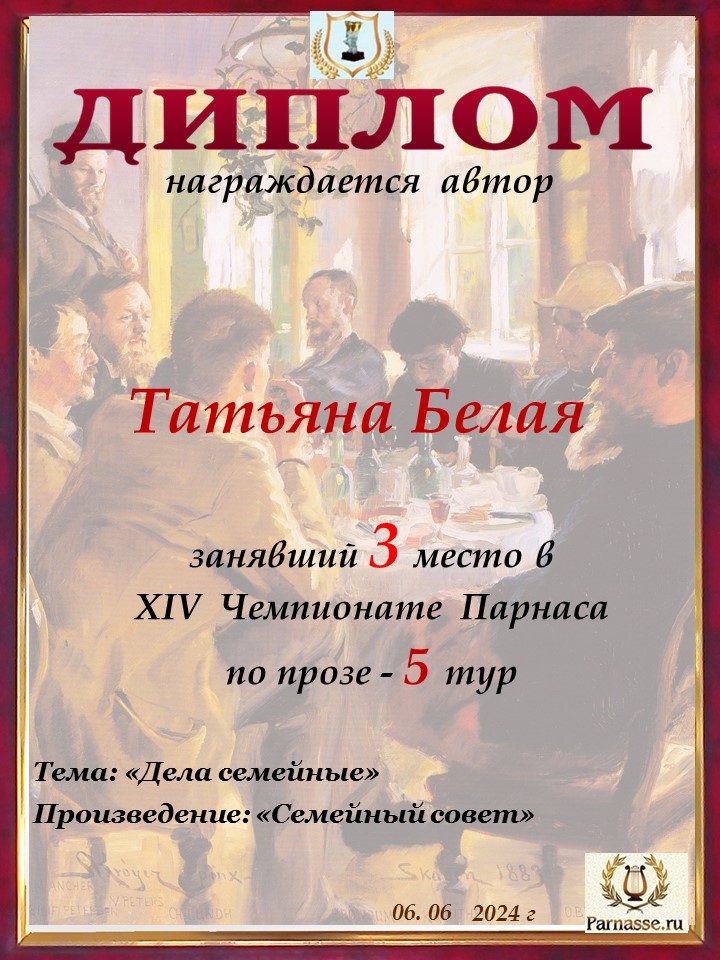 Поздравляю с занятым 1 местом в 3 туре XII Чемпионата Парнаса по прозе!