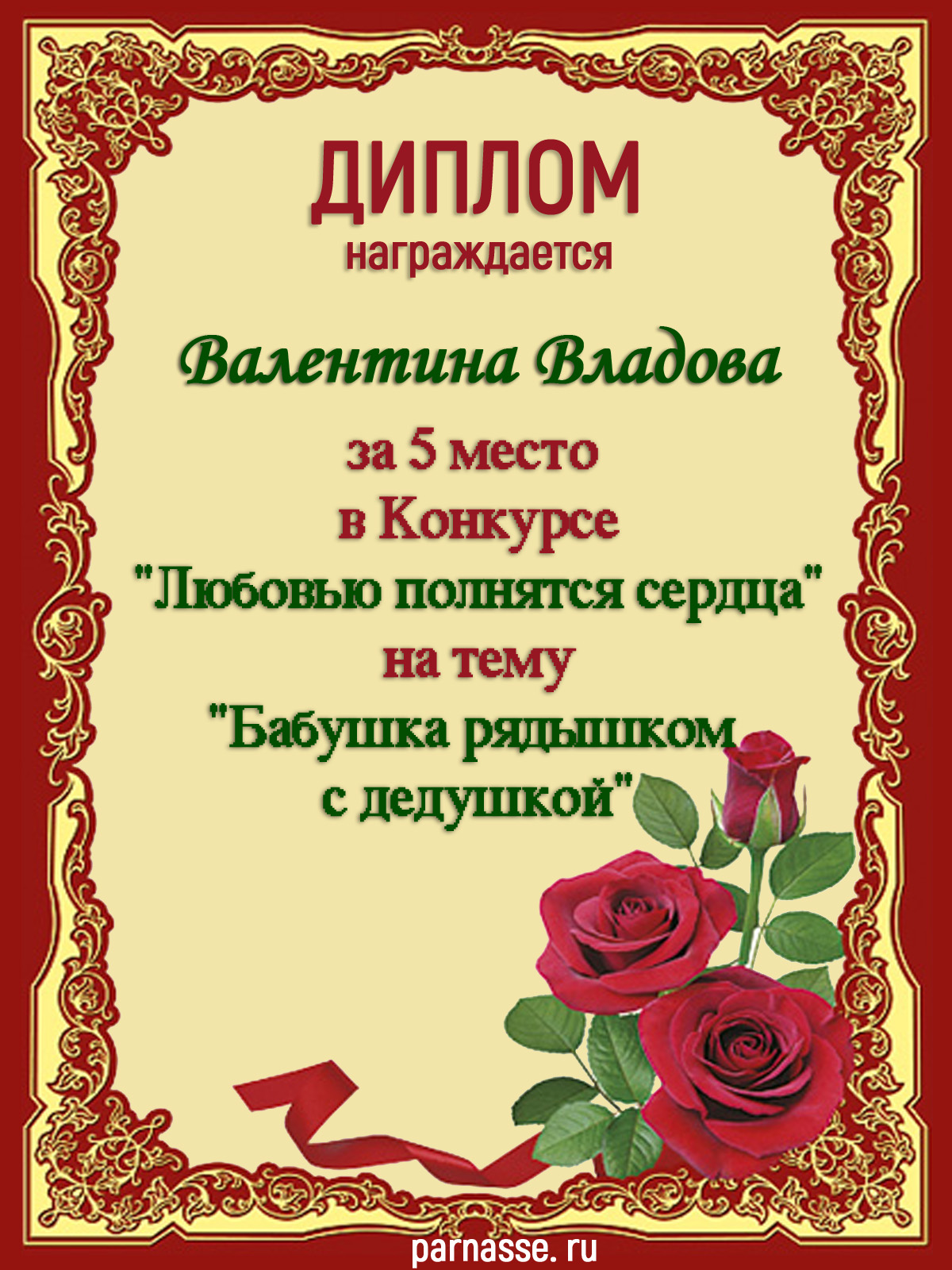 за 5 место в Конкурсе "Любовью полнятся сердца" на тему "Бабушка рядышком с дедушкой"