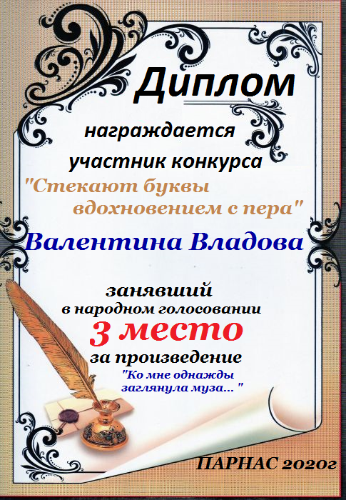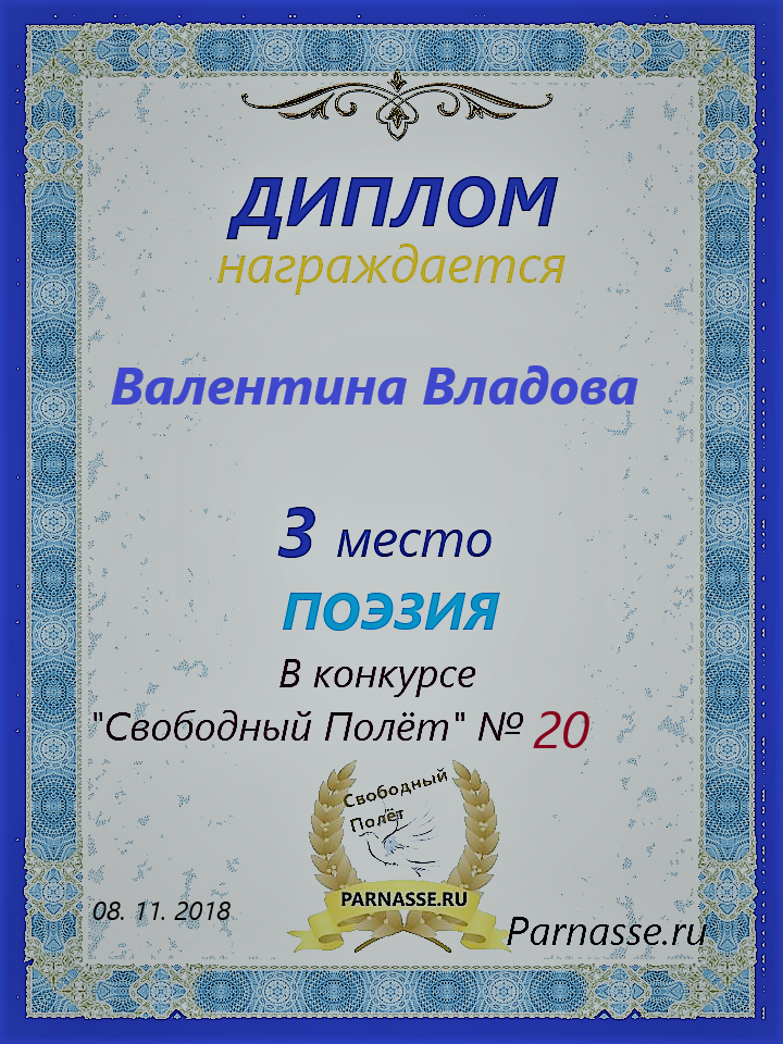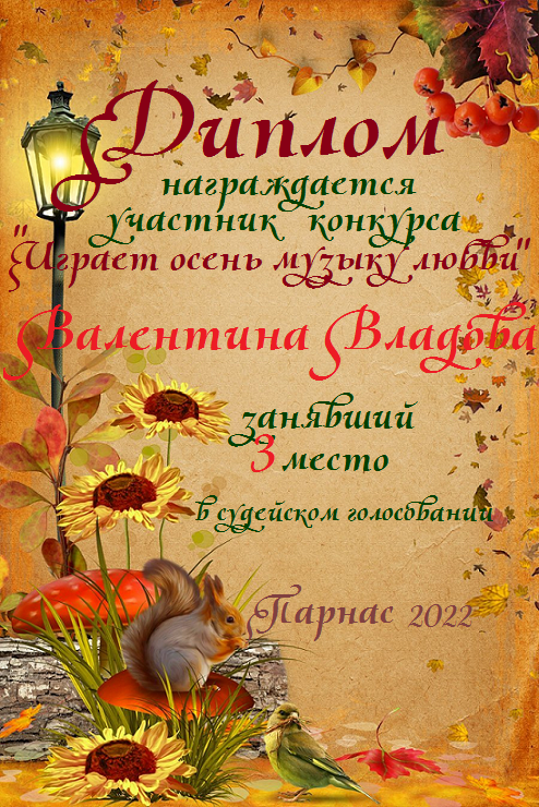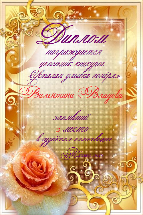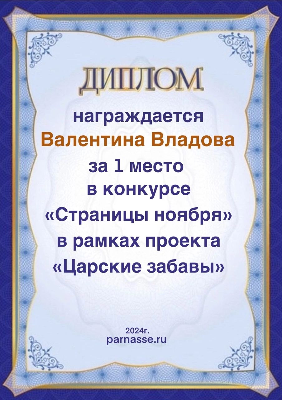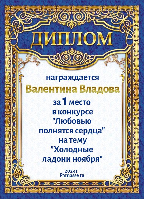 Медаль от ведущей конкурса "Философия ноября" за поэтический талант в раскрытии темы стихотворения!