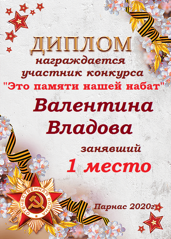 Первое место по решению Администрации и Главного судьи конкурса "Навечно в памяти"