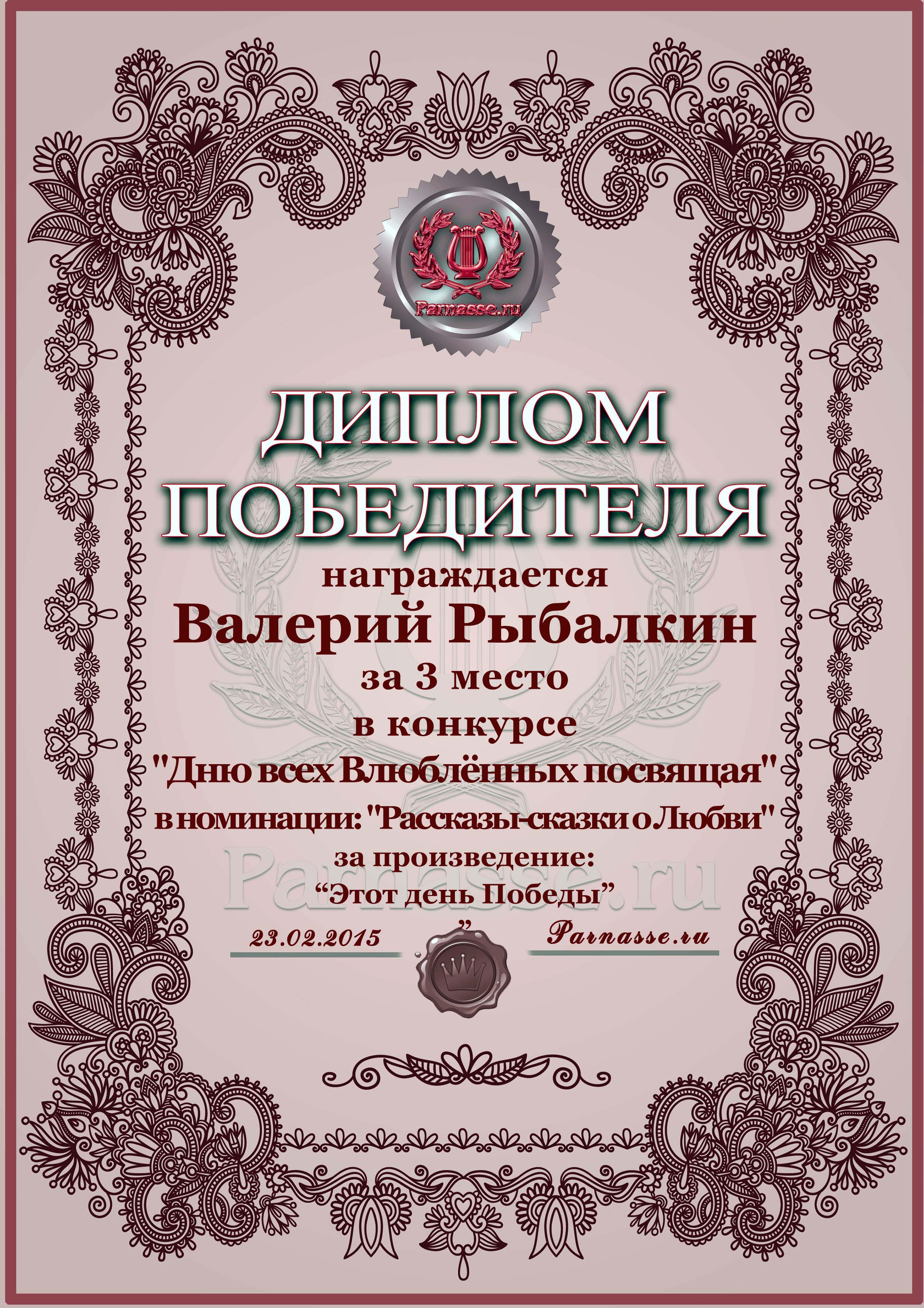 Третье место в конкурсе "Дню всех Влюблённых посвящая", прозаическая номинация, судейское голосование, произведение "Этот день Победы". Поздравляем!