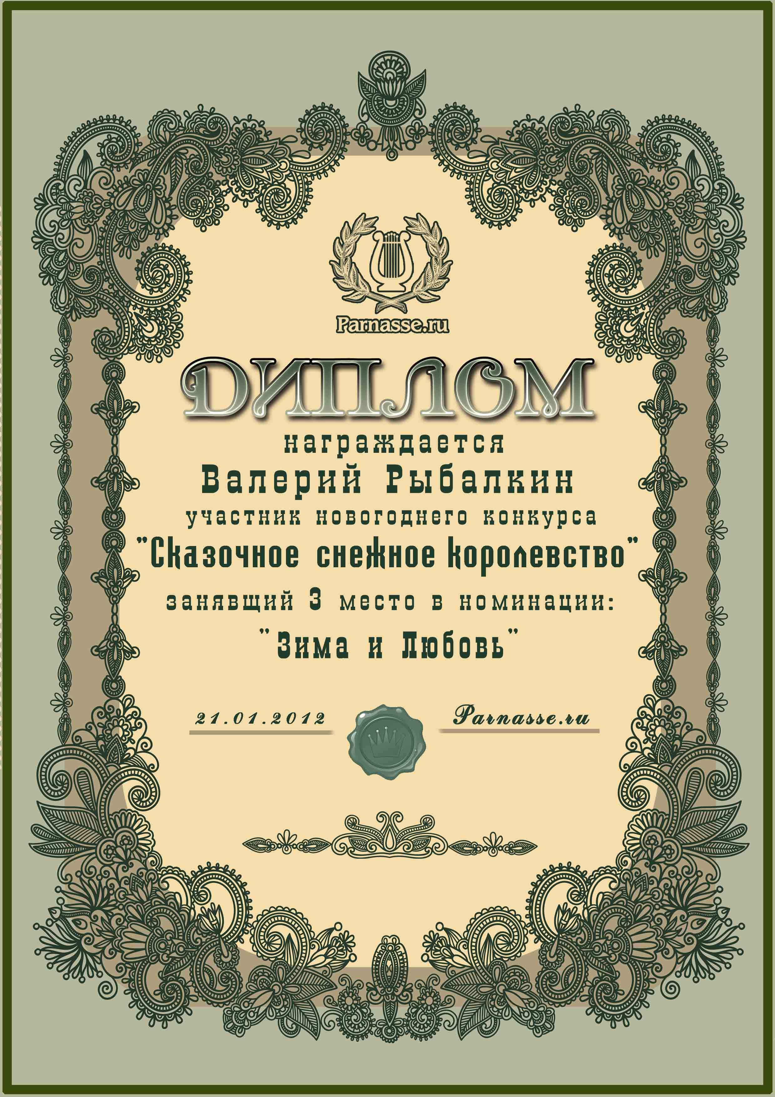 Диплом за 3 место в конкурсе "Дню всех Влюблённых посвящая"
