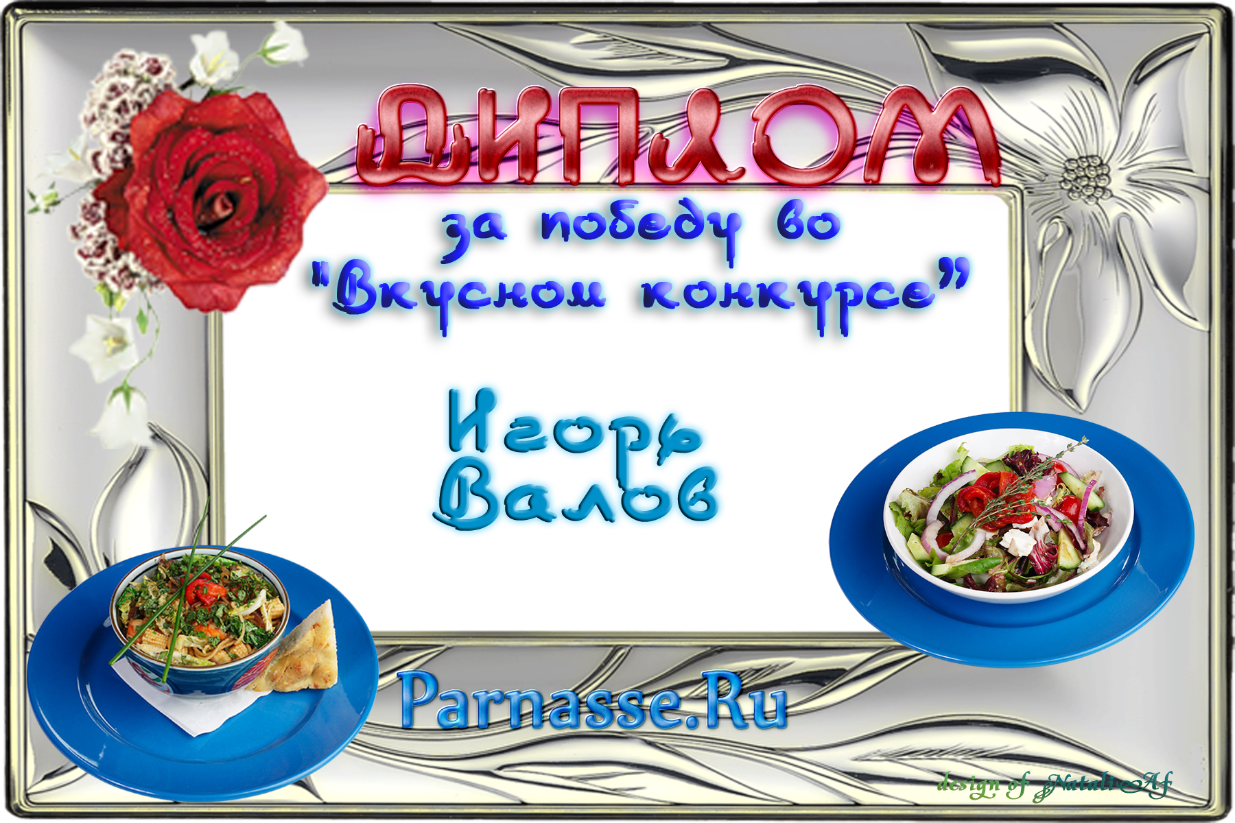 За литературное мастерство и высокий профессионализм в конкурсном произведении "РЕЦЕПТ.."! Конкурс "Вкусный"! Номинация "Вкусная проза"! Поздравляем!