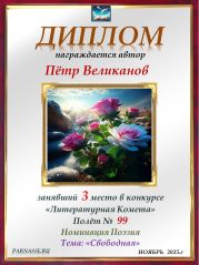 Вручается медаль за 3 место в конкурсе "ЛитКомета - Полёт № 98" - Номинация Поэзия
