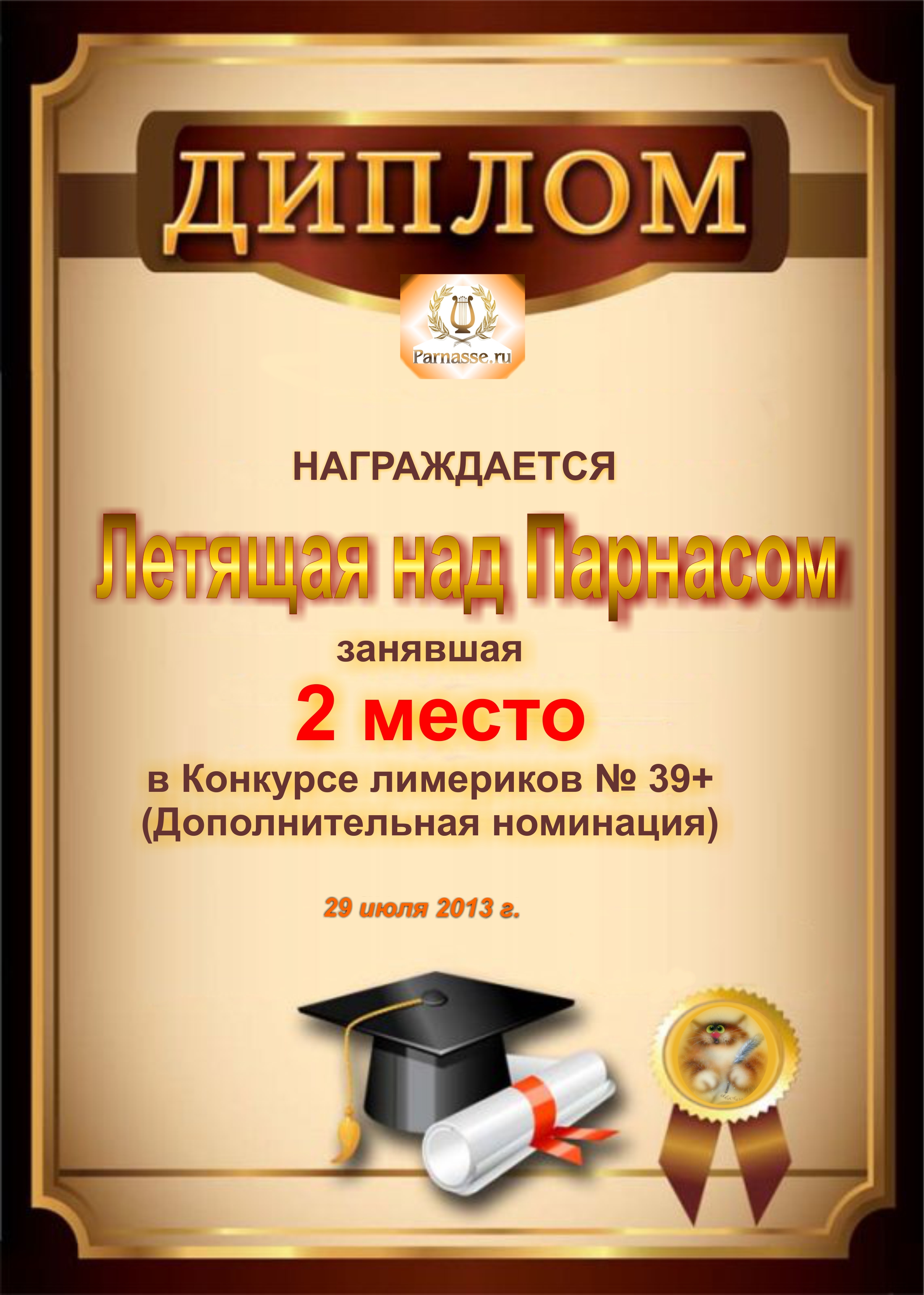 Диплом за победу и 2 место в дополнительной номинации конкурса лимериков № 39+ (29.07.2013 г.)