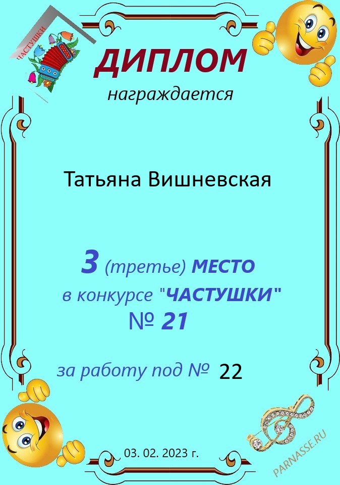3 место в конкурсе"ЧАСТУШКИ" № 21...за работу под № 22