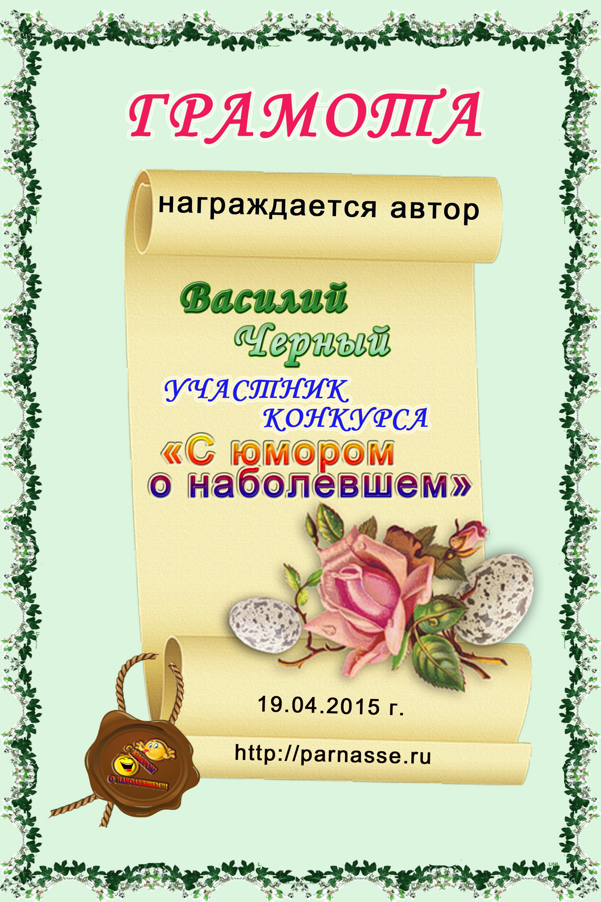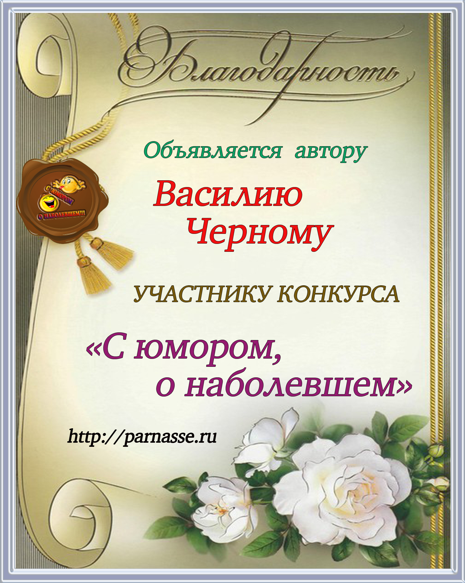 Номинация "Самое необычное поздравление Парнаса с Днём Рождения"Хочется выразить Вам, Васлий, огромнейшую благодарность за неординарное яркое поздравление! Мы благодарны Вам за, то, что именно "Парнас" стал для Вас теплым и дружеским домом, кругом друзей, помощником в публикации своих замечательных произведений в Интернете!