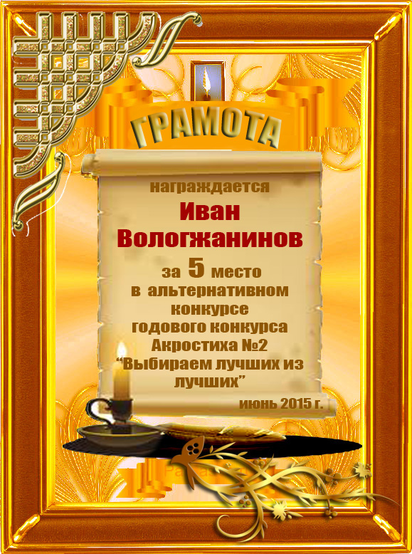 Грамота за 5 место во 2 годовом Альтернативном итоговом конкурсе АКРОСТИХА! ПОЗДРАВЛЯЮ!
