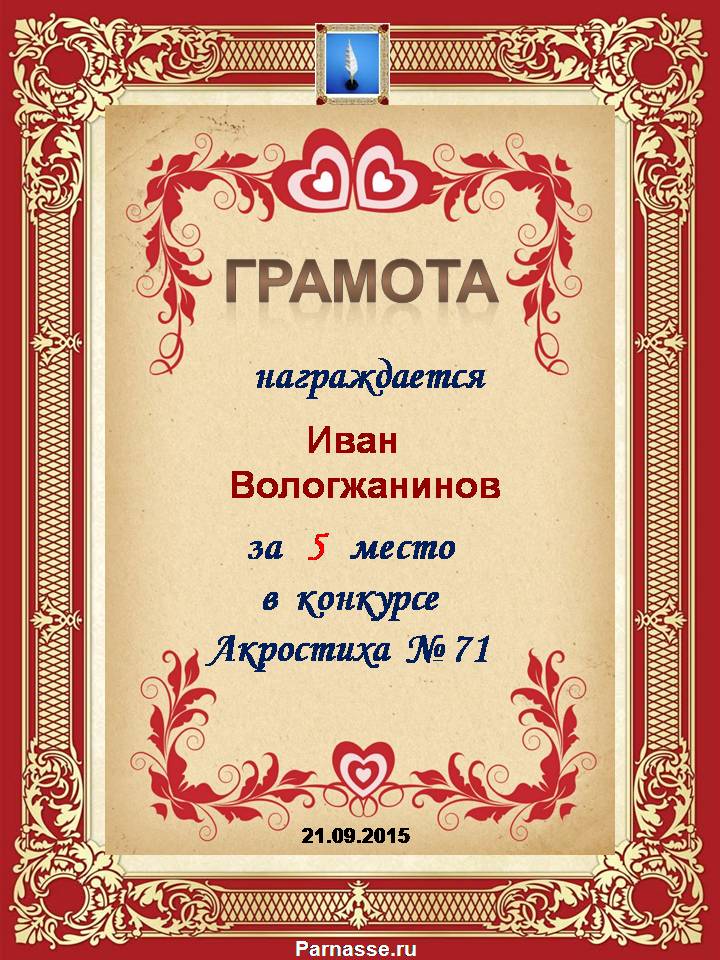 Грамота за 5 место во 2 годовом конкурсе Акростиха по итогам судейского голосования (Альтернатива)! ПОЗДРАВЛЯЮ!