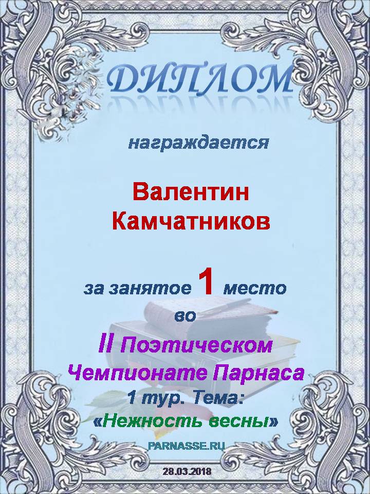 Диплом за I место во II Поэтическом Чемпионате Парнаса. I тур . Тема "Нежность весны"