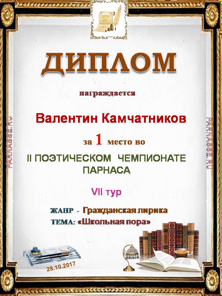 За 1 место в 7 туре II Чемпионата поэзии Парнаса, тема "Школьная пора", жанр - гражданская лирика
