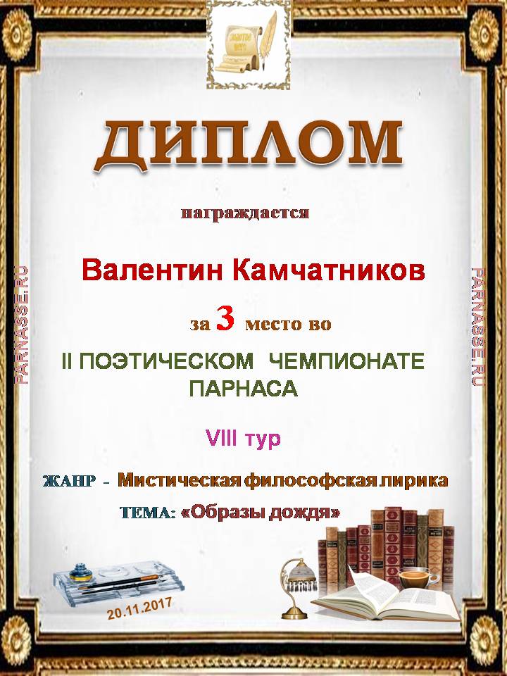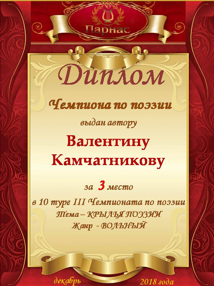 Диплом за I место  во II Поэтическом  Чемпионате Парнаса. I тур . Тема