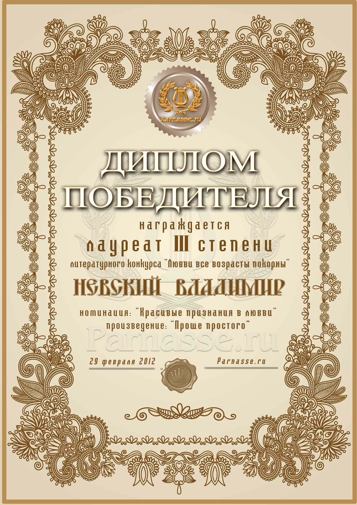 Диплом лауреата III степени лит.конкурса "Любви все возрасты покорны"