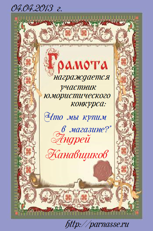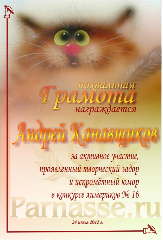 Похвальная грамота за 4 место в конкурсе лимериков № 38+ (8.07.2013 г.)