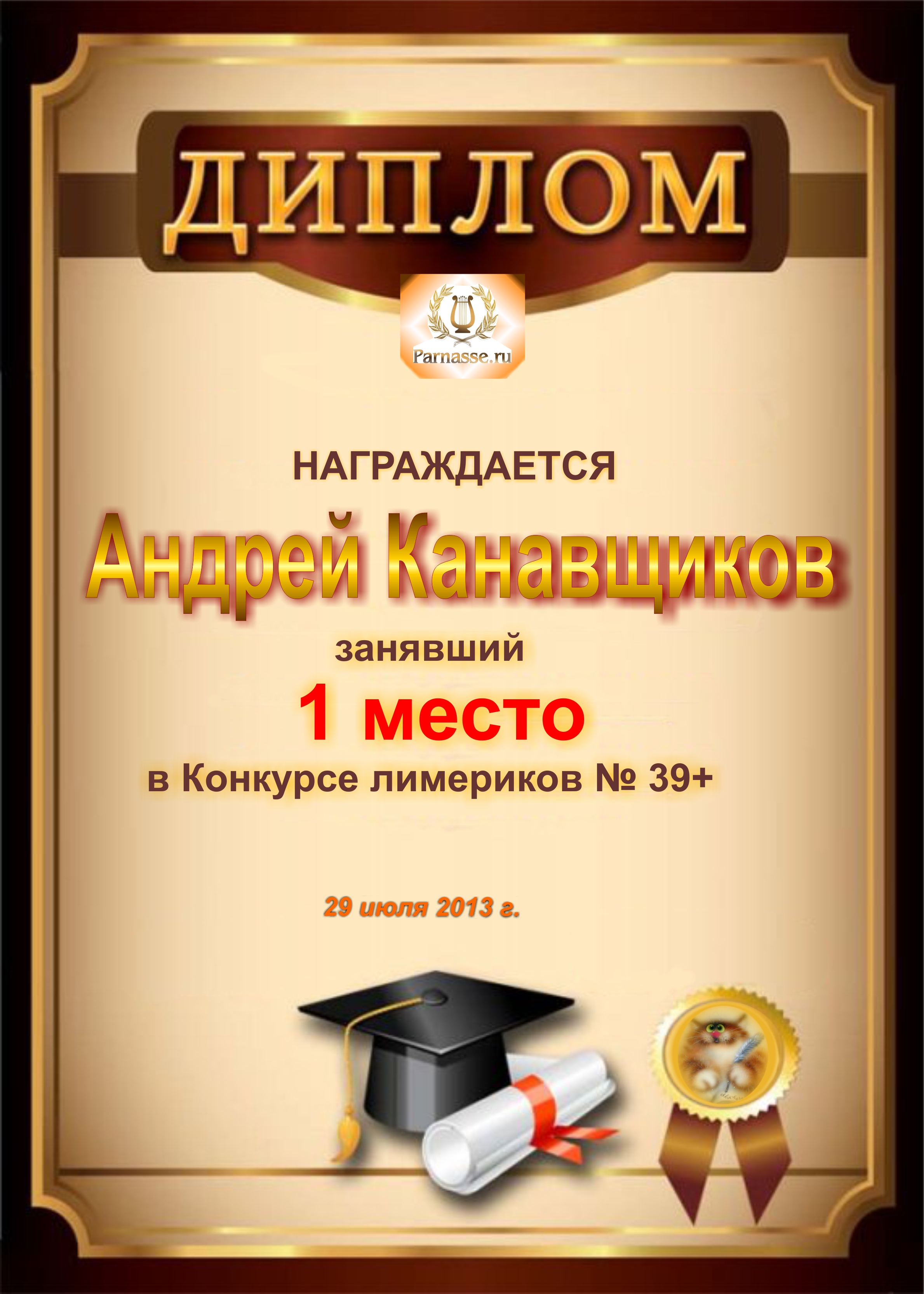 Диплом за победу и 1 место в дополнительной номинации конкурса лимериков № 35+ (13.05.2013 г.)