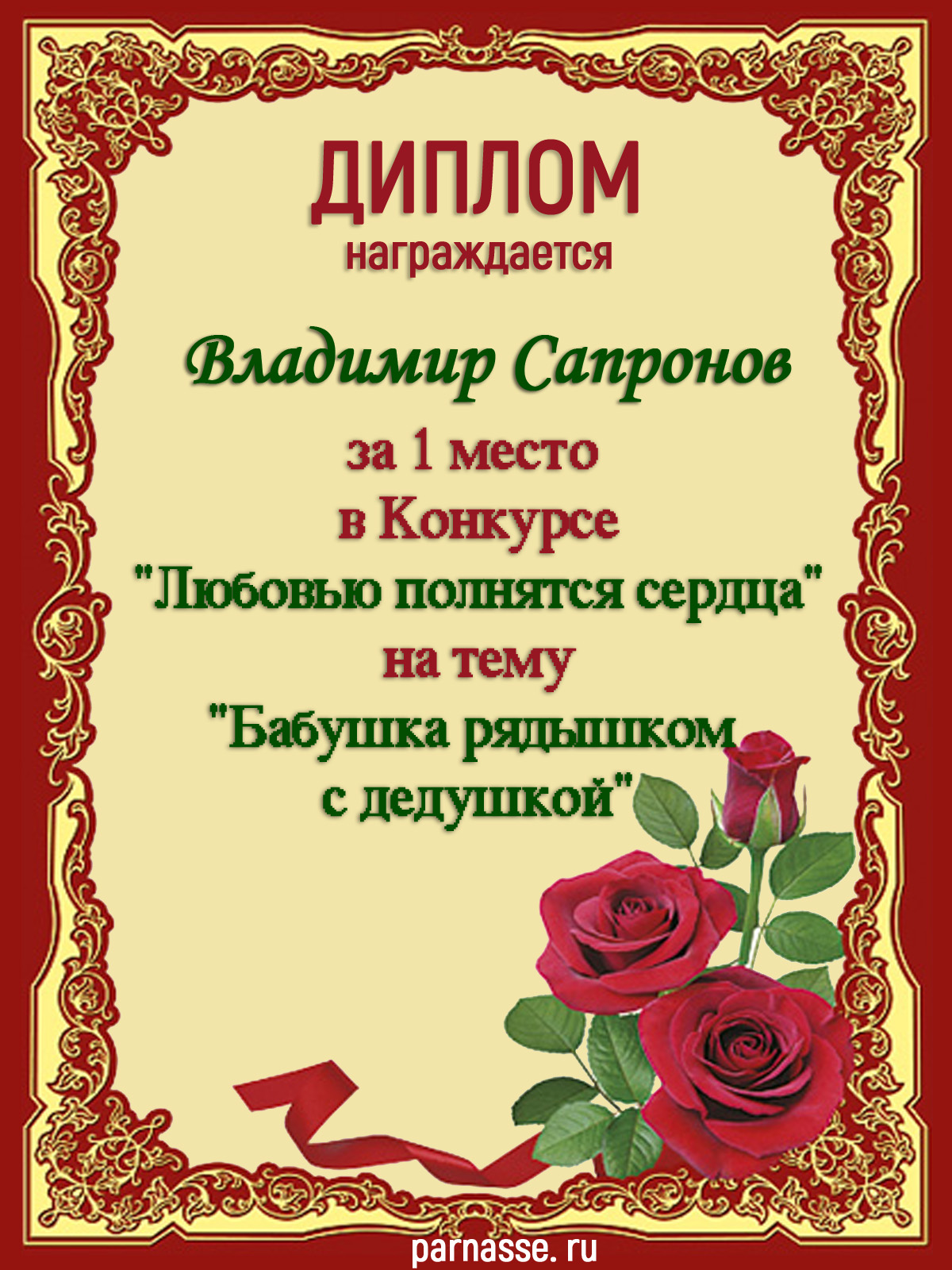 за 1 место в Конкурсе "Любовью полнятся сердца" на тему "Бабушка рядышком с дедушкой"