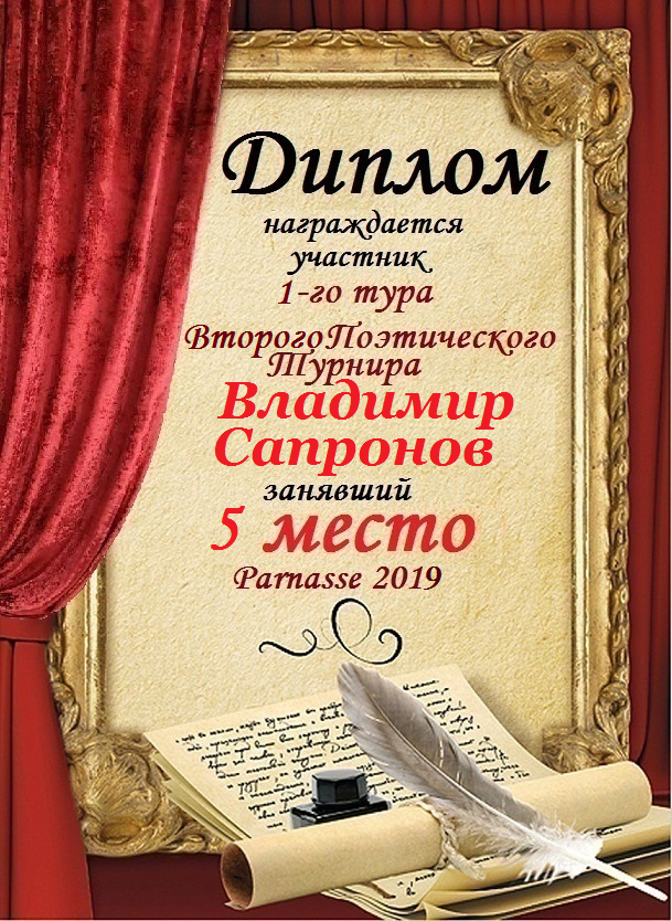 Пятое место в 3-м туре Второго Поэтического Турнира "Любовь многогранна" за произведение «Под лёгкой крышей». Поздравляем!