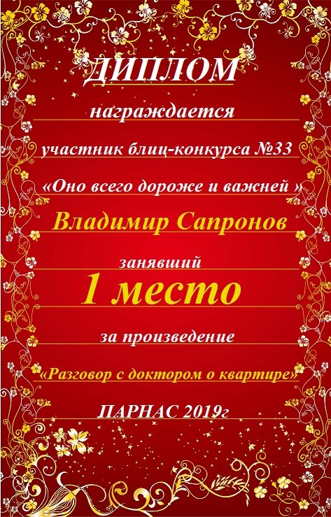 Первое место в Блиц-конкурсе №33 "Оно всего дороже и важней" за произведение " Разговор с доктором о квартире". Поздравляем!