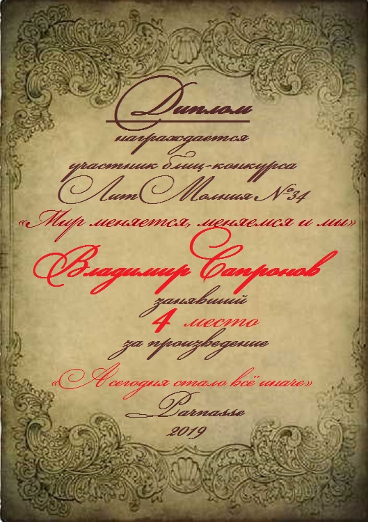 Четвёртое место в Блиц-конкурсе №34 " Мир меняется, меняемся и мы" за произведение «А сегодня стало всё иначе ». Поздравляем!